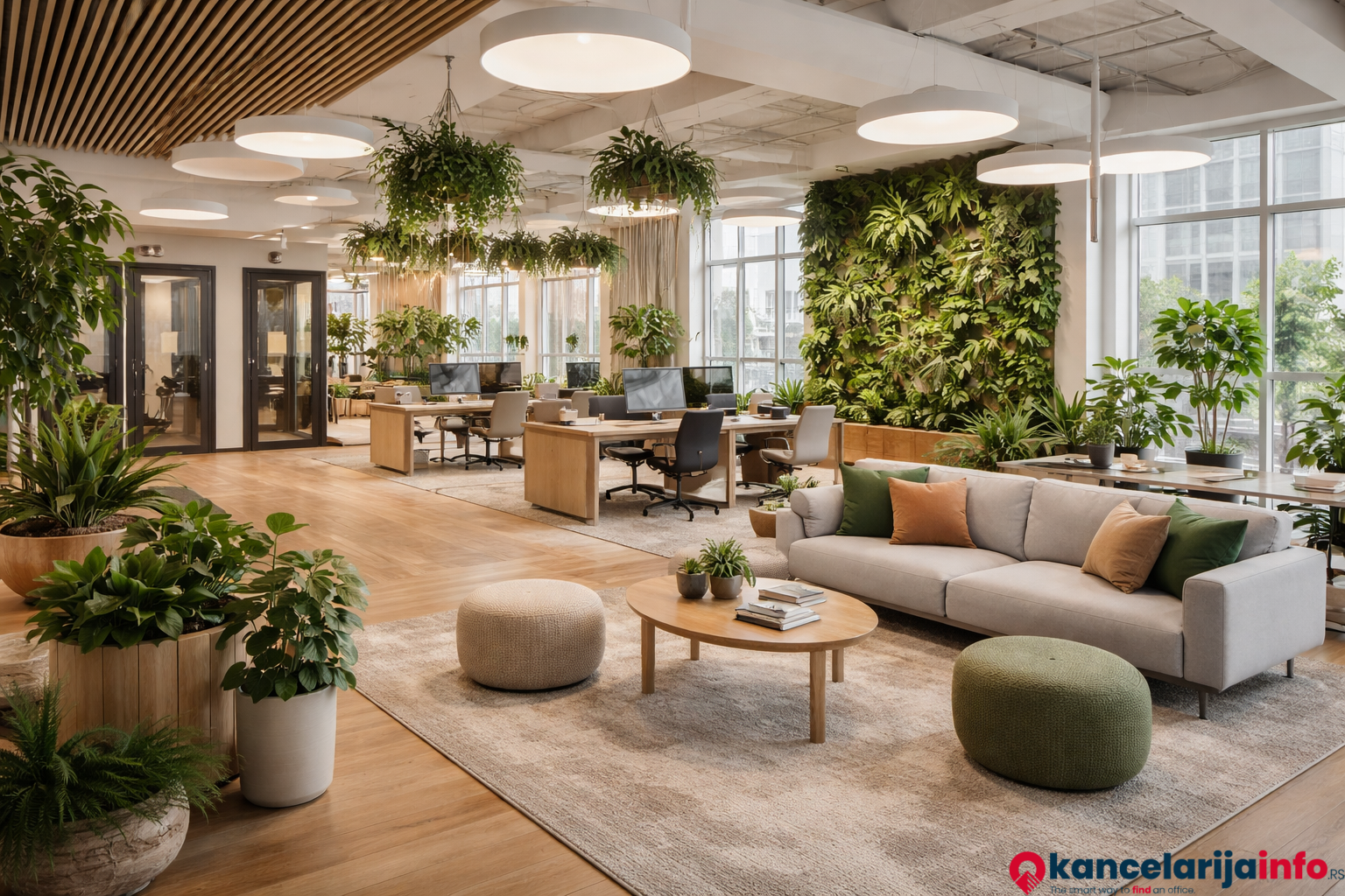 Biophilic dizajn — integracija prirodnih elemenata u unutarnje prostore — raste kao globalni trend. U 2026. to znači ne samo biljke u prostoru, već i pametno korištenje prirodne svjetlosti, zelenih zidova, ekoloških materijala i prostora koji potiču kvalitet zraka. Ovakvi elementi pozitivno utječu na koncentraciju, kreativnost i osjećaj zadovoljstva.
