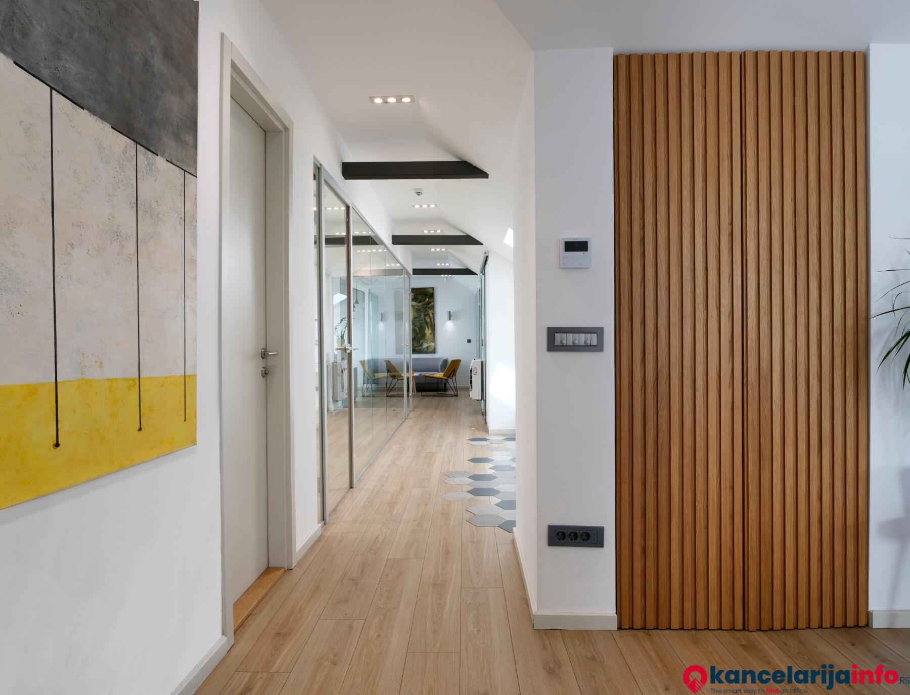 Prostor je kompletno namešten i dizajniran po savremenim standardima, sa enterijerom u svetlim tonovima, obogaćenim drvenim detaljima koji unose toplinu i udobnost u poslovni ambijent.